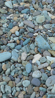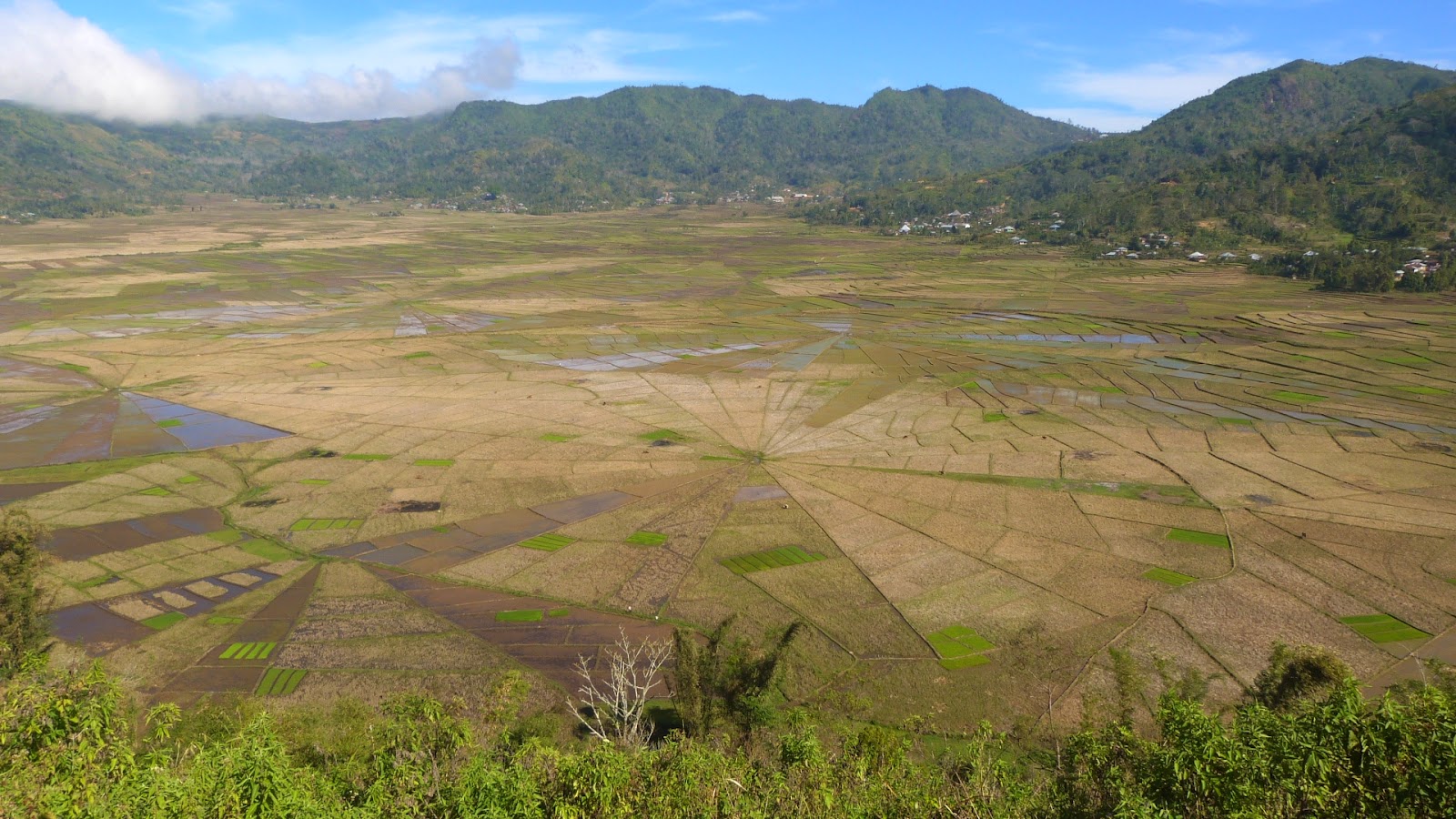 Reisfelder in Form von Spinnennetzen und einen Strand mit farbigen Steinen. Auf